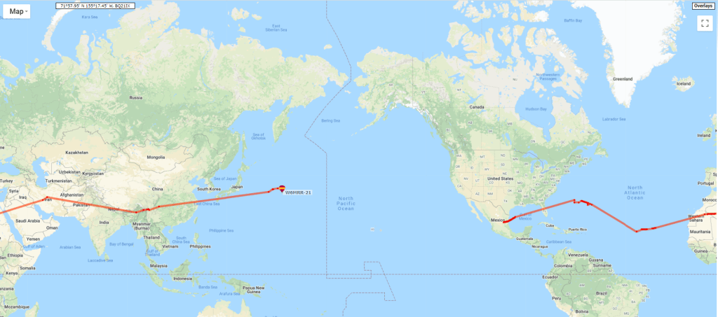 After more than 10 days in the air, W6MRR-21 stopped transmission over the Pacific. Circumnavigation or bust!