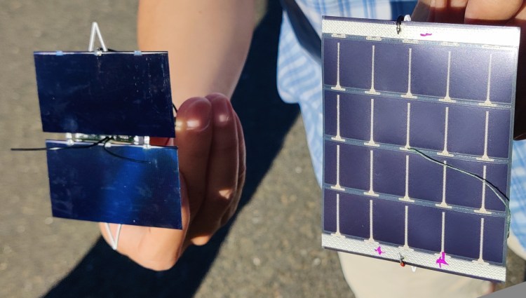 Next up was AG6NS-13 pictured on the left with two tiny solar cells that were fabricated in Japan and acquired at a local Electronics Flea Market having originally been destined for a satellite some years ago. The panel on the right is a single PowerFilm flexible panel that have typically been flown as a pair on previous flights. This one was destined to launch as W6MRR-28, however a nick in the balloon scrubbed the attempted launch today.