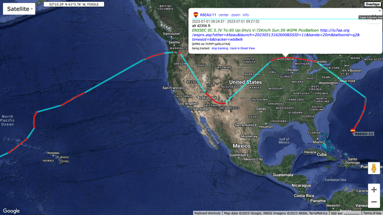 While we weren’t able to set a new record of three launches in a single day, we did get three RP 2040 Pico Balloon’s simultaneously aloft and transmitting. Over the last week K6EAU-11 has gone from the middle of the North Pacific Ocean to starting it’s third crossing of the Atlantic. It crossed most of the United States in 48 hours with a brief trip in to Canada over the Great Lakes.
