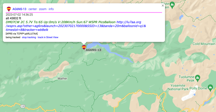 The launch was successful with a light ground wind and had a steady ascent at 09:32am local time on July 2nd 2023. Good tracking data was being received and reported by WSPR stations and it looks to have concluded it’s first day of flight at 36,000′ having crossed in to Nevada at getting to grid square DM18gd reporting 4.7v with a sun angle dropping below 21 degrees on the horizon.