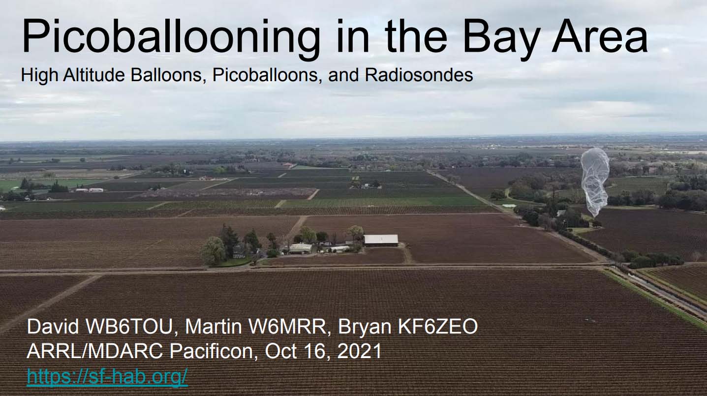 sf-hab presented “Picoballooning in the Bay Area” at the Pacificon 2021 Amateur Radio convention at the San Ramon Marriott in San Ramon, California on October 16, 2021. Watch the recorded presentation.